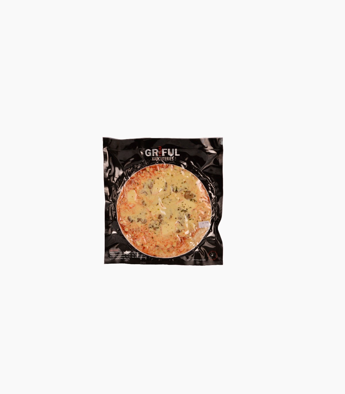 Ingredients: Farina de blat, sucre, aigua, sal, llevat, formatge brie, xampinyons, tomàquet, formatge mozzarella i emmental, orenga, conservador (E-282, E-202).