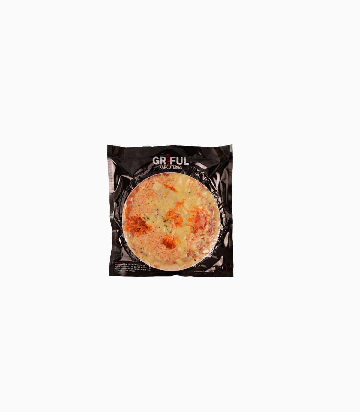 Ingredients: Farina de blat, sucre, aigua, sal, llevat, tomàquet, formatge mozzarella i emmental, orenga, sobrassada, conservador (E-282, E-202).