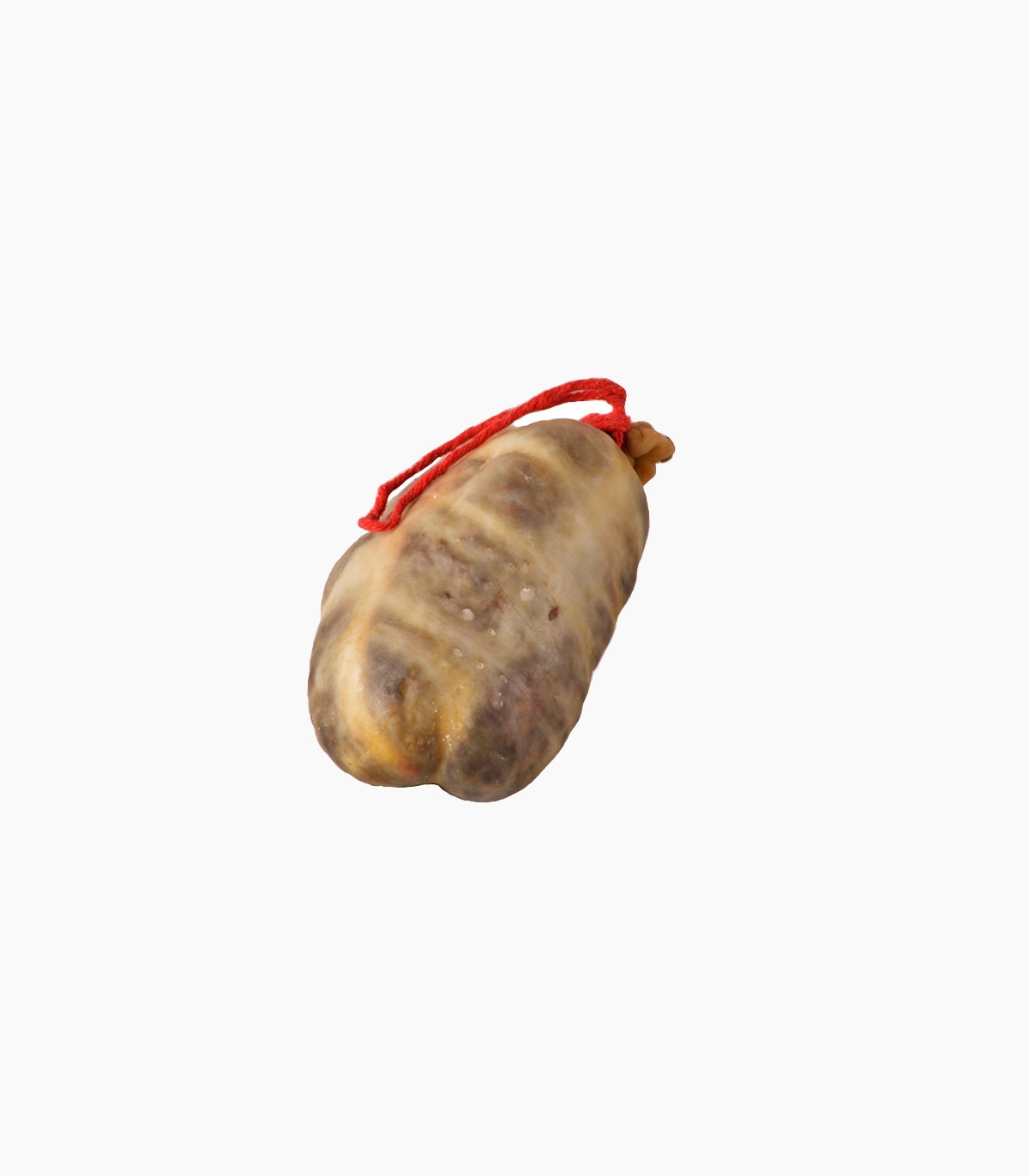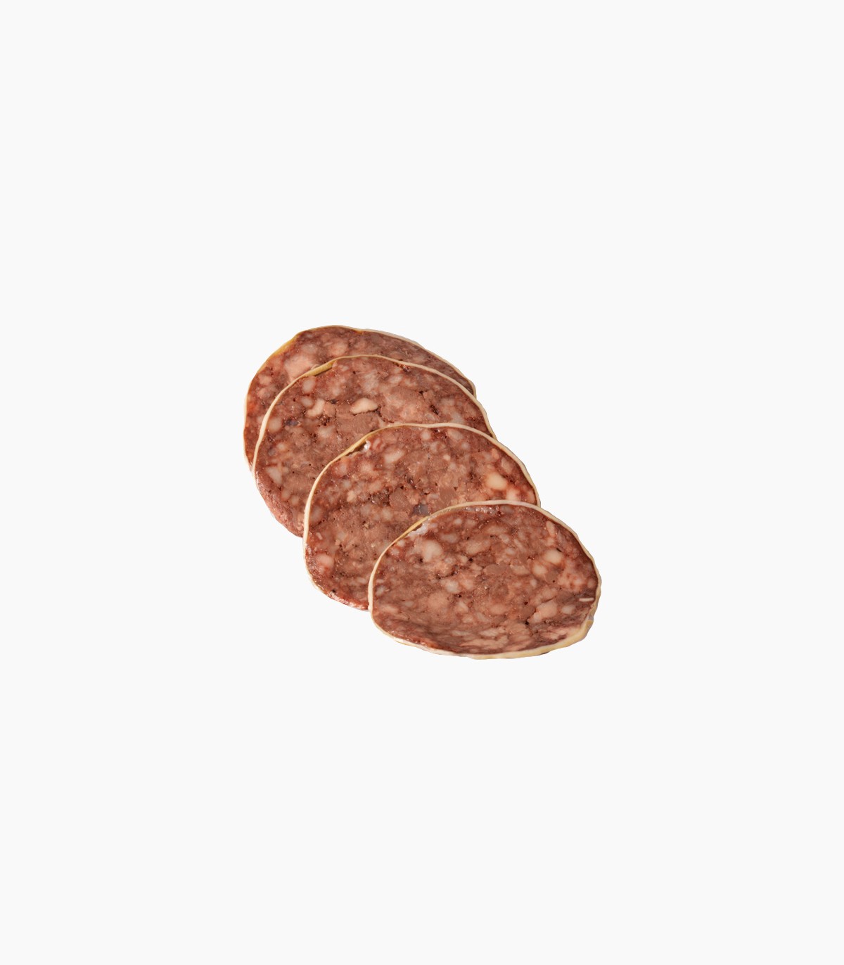 Embutido elaborado a partir de carne y menudencias de cerdo. Todo picado añadiendo sal marina y pimienta negra y embutido en un tripa natural. Seguidamente cocido a tiempo y temperatura justa. Presentación en piezas de 800gr. Se puede pedir envasado al vacío.