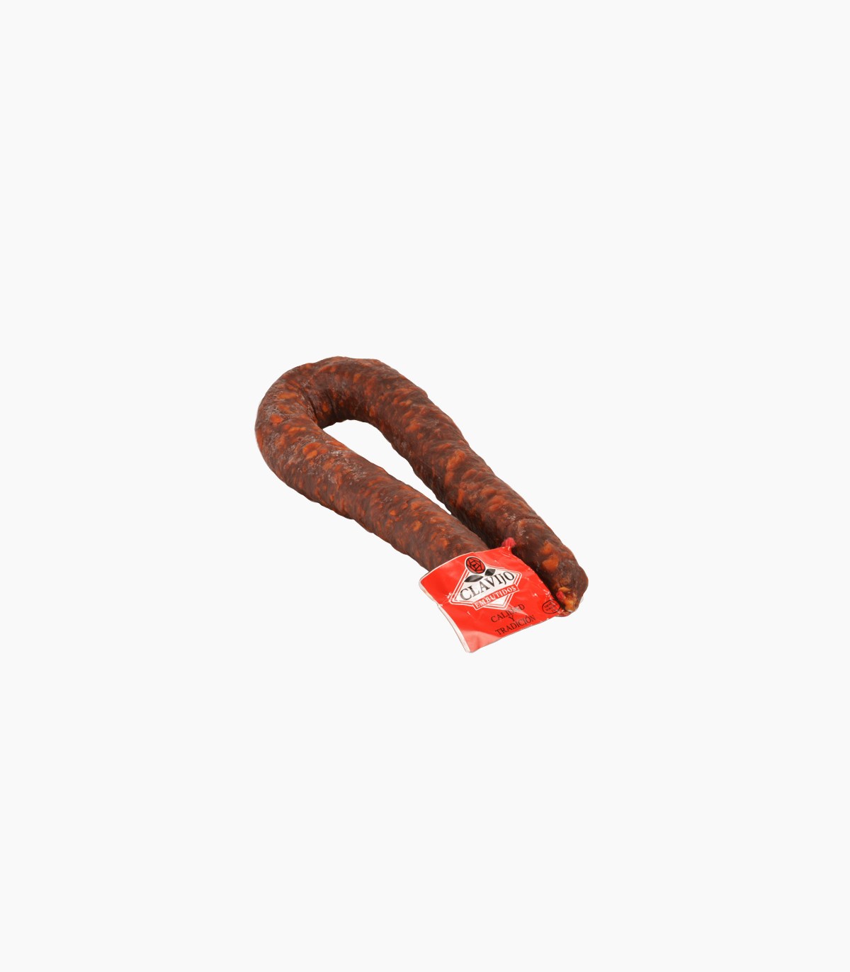 Chorizo riojano es un embutido curado en el aire libre, elaborado con carne picada de cerdo y adobada con pimentón de la vera, ajo y sal. Apto para celíacos. Piezas de 450gr aproximadamente.