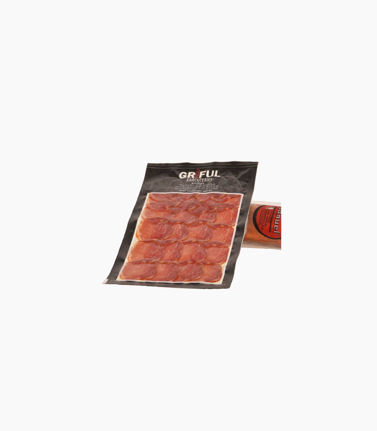 Ingredientes: Caña de Lomo de cerdo de bellota ibérico, sal, azúcares, especias, lactosa en polvo, caseinato sódico, dextrosa, dextrina blanca de patata, antioxidante (E-301,E-331) conservadores (E-250, E-252) y tripa artificial de colágeno ( Colágeno bovino, agua, E-422 y triglicérido caprílico/capricho).