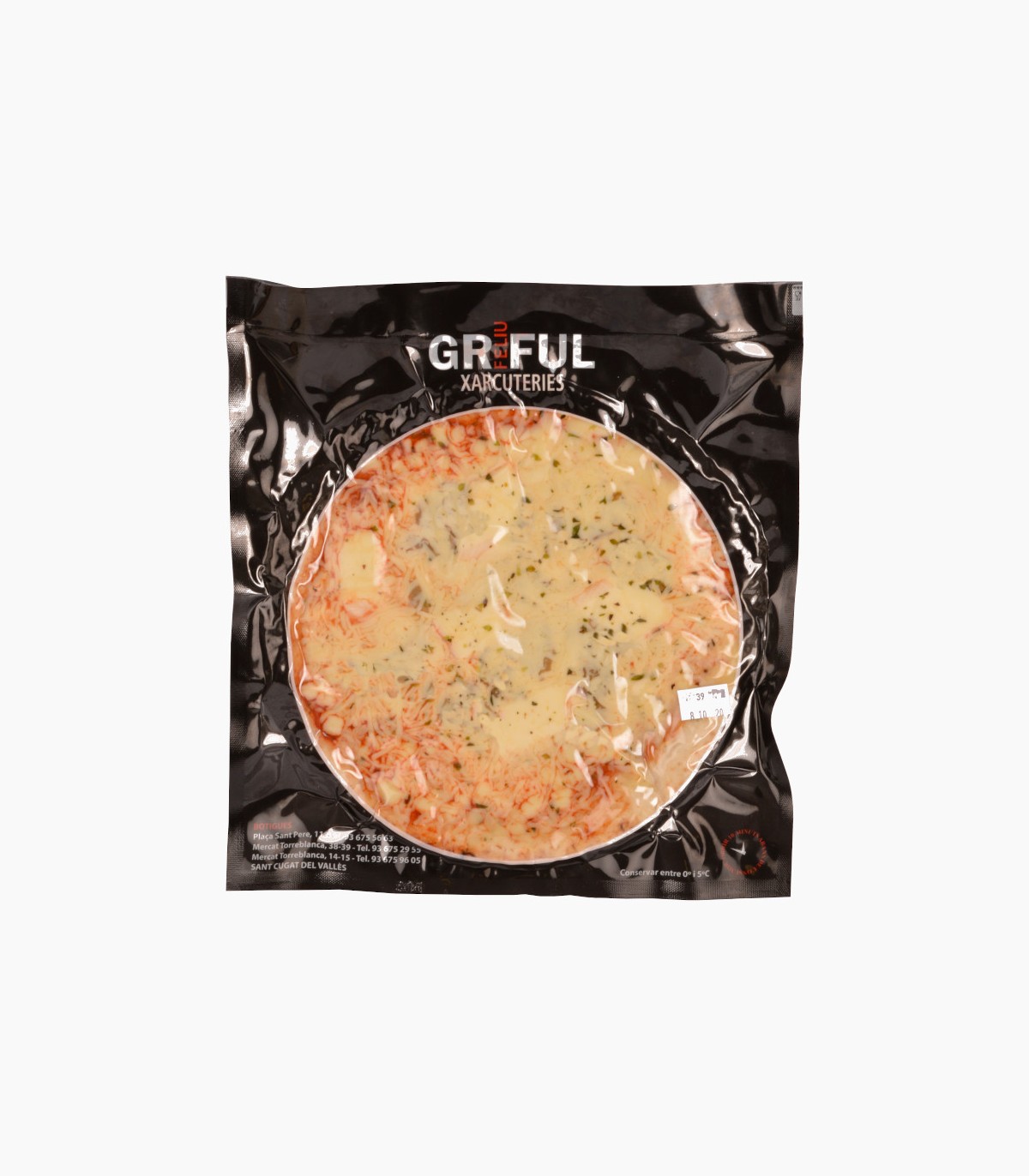 Ingredientes: Harina de trigo, azúcar, agua, sal, levadura, queso havarti, queso azul, brie, parmesano, tomate y mozzarella, orégano, conservador (E-282, E202).