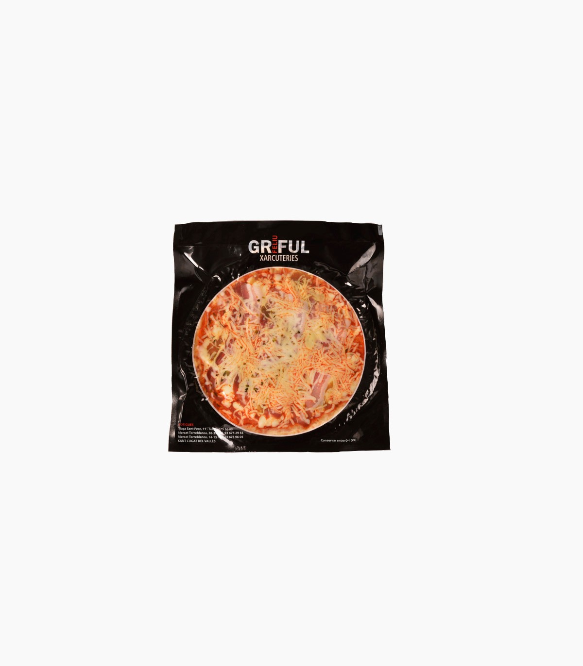 Ingredientes: Harina de trigo, agua, azúcar, sal, levadura, Bacon, tomate, queso mozzarella y emmental, orégano, E-282 y E-202).