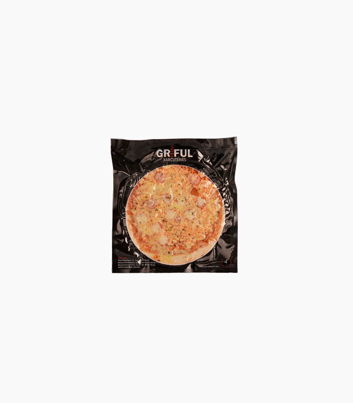 Ingredientes: Harina de trigo, agua, azúcar, sal, levadura, tomate, queso mozzarella y emmental, Frankfurt, orégano, conservador (E-282, E-202).